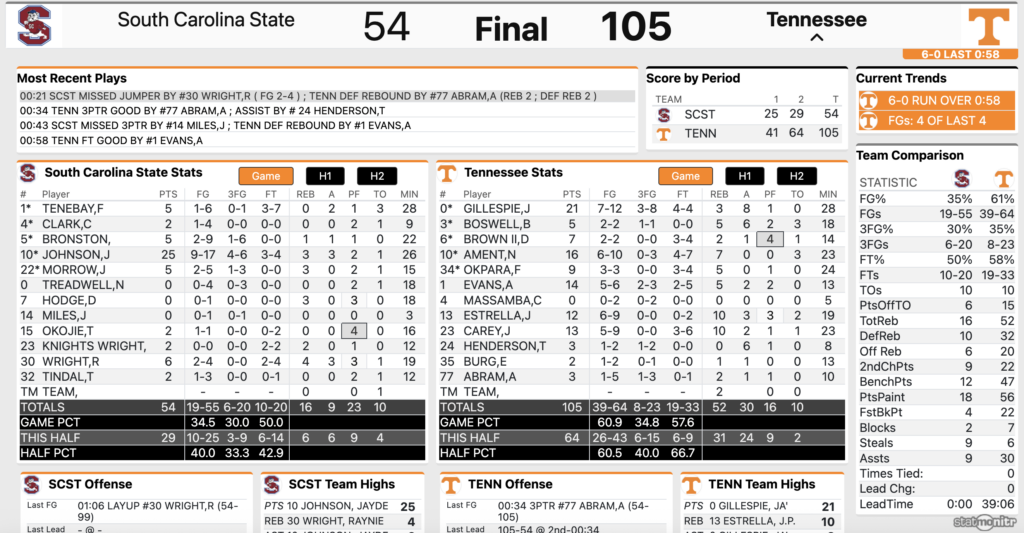 Tennessee basketball took care of business in its final tuneup before the start of SEC play, dominating South Carolina State 105-54 on Tuesday night. The win marked Tennessee’s 44th straight home non conference win— a new program record.