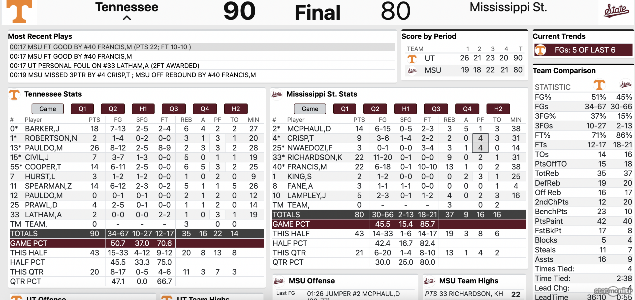 Offensively, Tennessee produced 16 rebounds in the matchup. This resulted in 12 second-chance points.