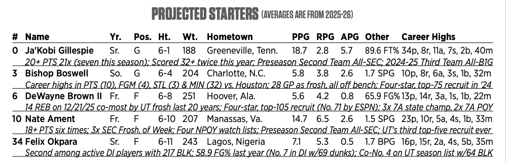 Assists: Ja’Kobi Gillespie — 5.7 APG, 2.4 TOPG, 31.9 MPG